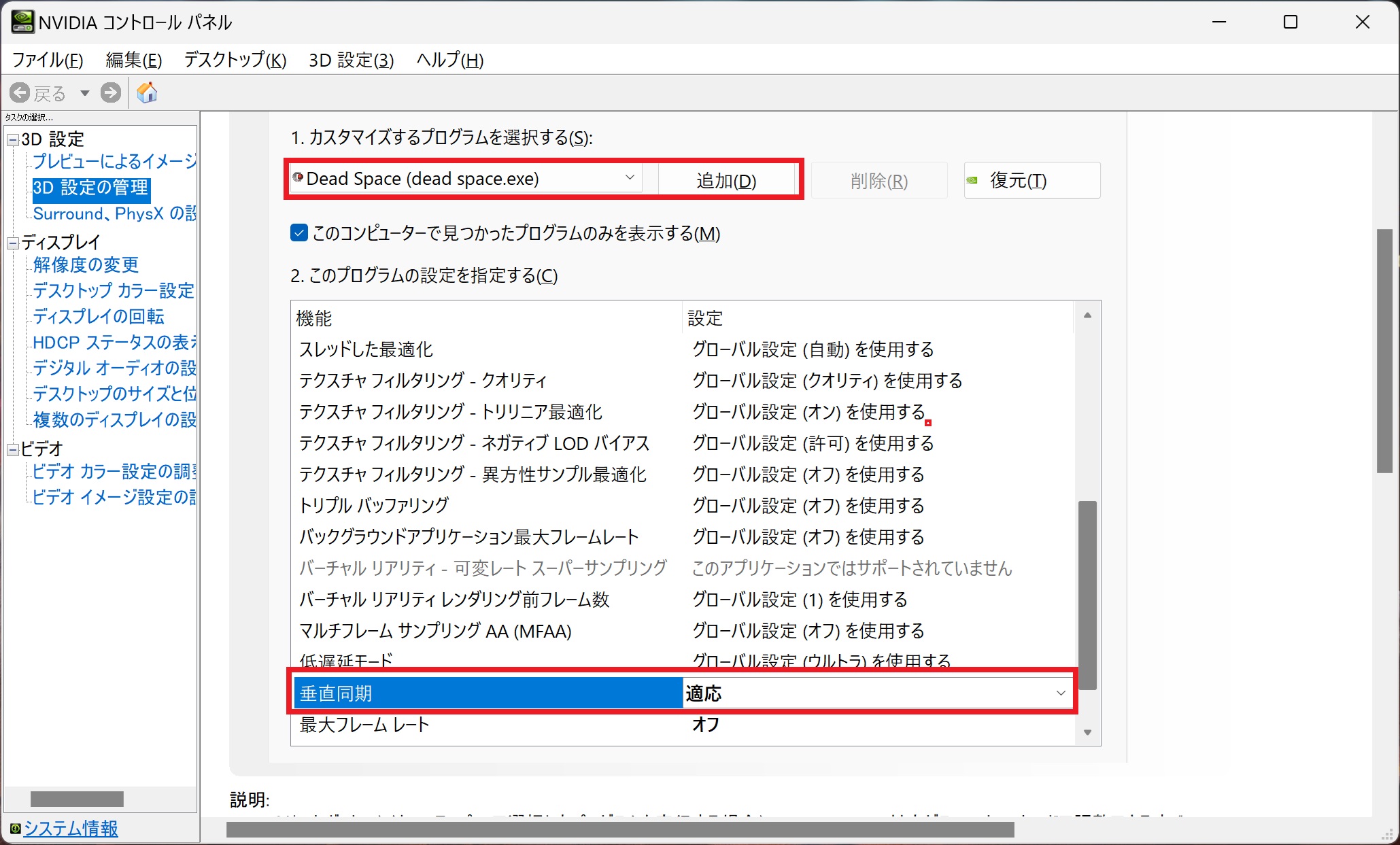 グラフィックボードのコントロールパネルから実行ファイルを指定して